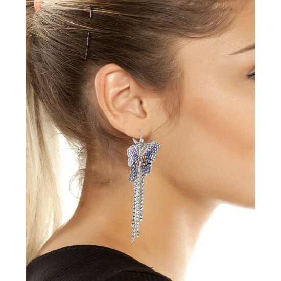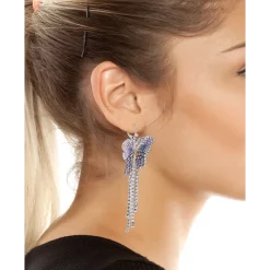 Chandelier earrings featuring glistening butterfly adorned with colorful mixed stones and dangling stone cup chain fringe.