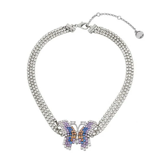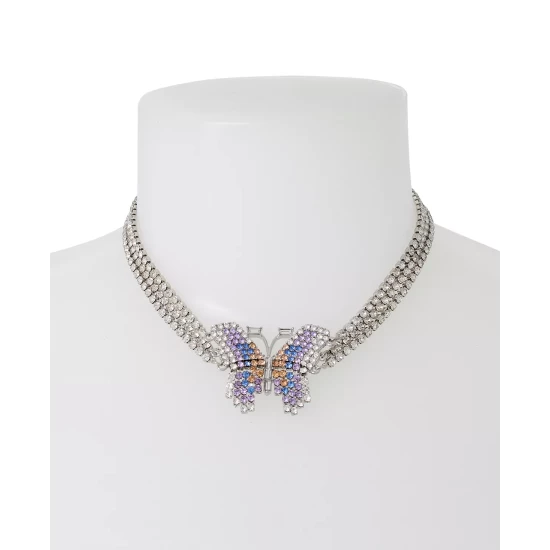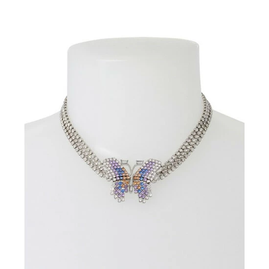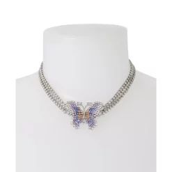 Refined three-row tennis choker necklace featuring glistening butterfly at front adorned with colorful mixed stones.