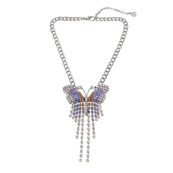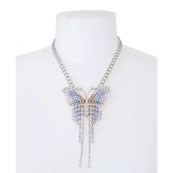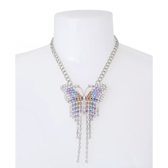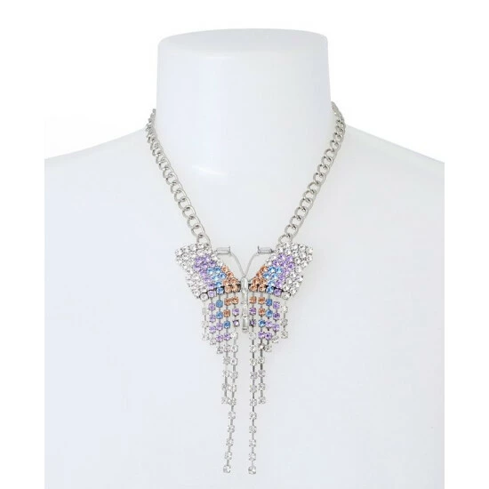 Striking curb chain necklace featuring glistening butterfly pendant adorned with colorful mixed stones and delicate chain fringe.