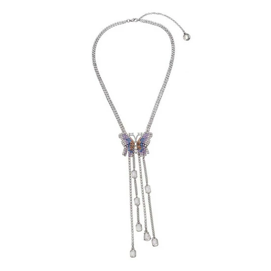 Glistening two-row tennis necklace featuring whimsical butterfly at front adorned with colorful mixed stones and delicate chain fringe sprinkled with crystal stone gems.