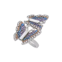 Sophisticated statement ring featuring glistening butterflies adorned with colorful mixed stones.