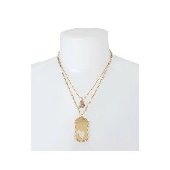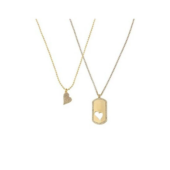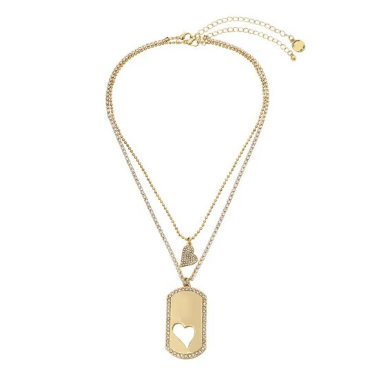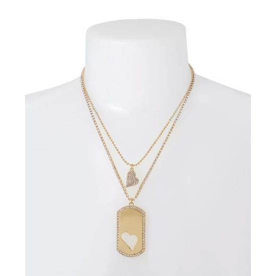 Refined chain necklace set featuring shorter bead chain strand with reversible heart charm pendant with glistening pave at one side, and coordinating longer tennis strand with heart cut-out dog tag charm pendant.