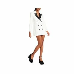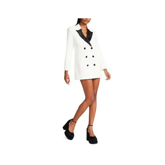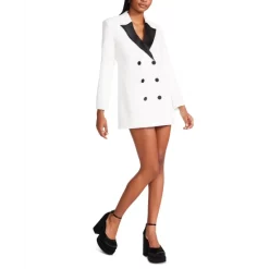 The Lana dress from Steve Madden is a tuxedo style blazer dress with a contrast satin lapel and a double breasted button front closure that brings a professionally polished look with feminine flair to your wardrobe.