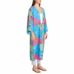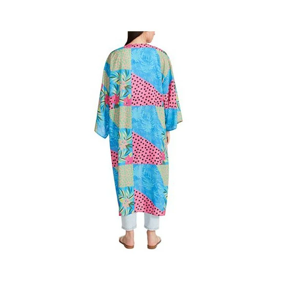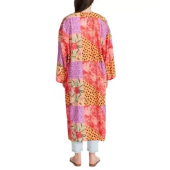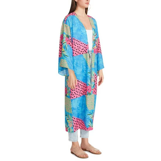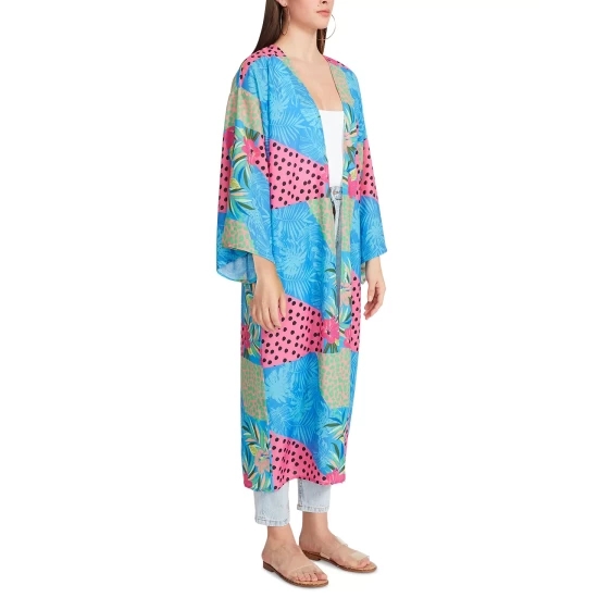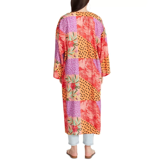 Top off your look with a pop of color with the chic style of this tropical patchwork moss crepe kimono by Steve Madden.