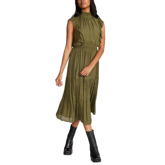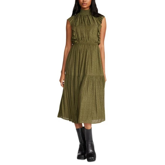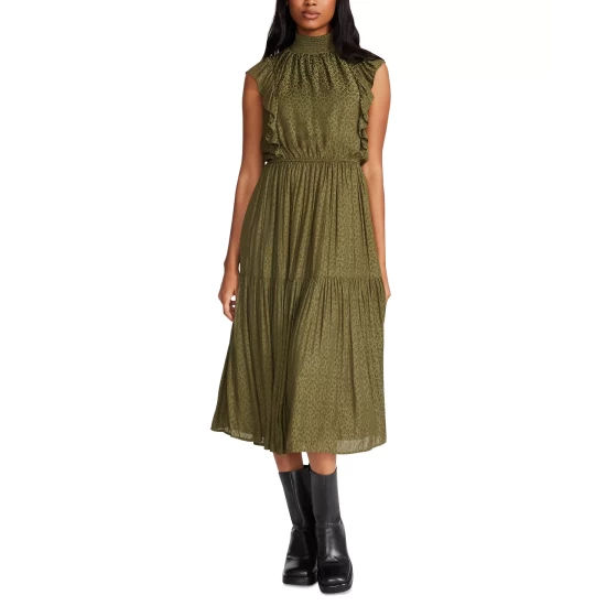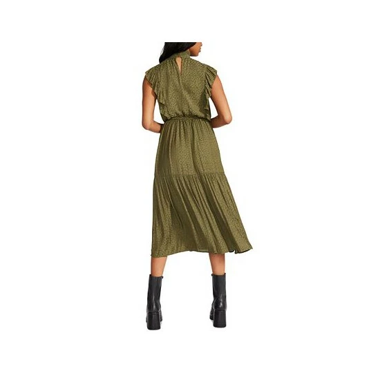 The Anna dress from BB Dakota by Steve Madden is an effortless, tiered maxi dress. Fashioned in a fierce animal jacquard satin, Anna has a mock-neck and a button-closure