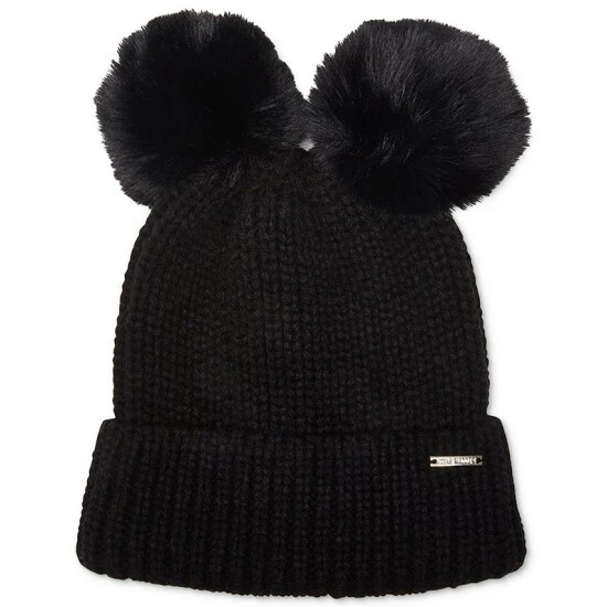 - Style Details: Ribbed-knit; logo hardware; cuffed; faux fur double pom at crown
