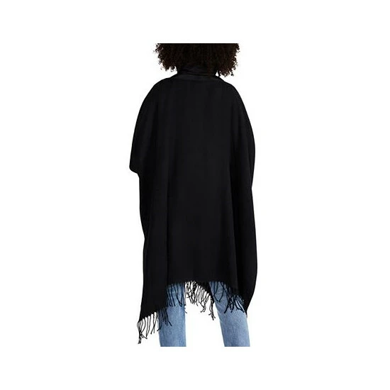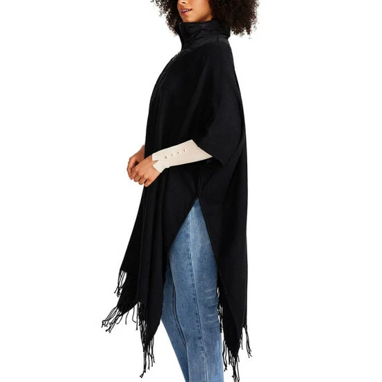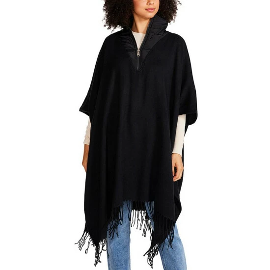 This Steve Madden topper has cute fringe detail with a warm and cozy puffer-style neckline and collar for a perfect weekend cover up.